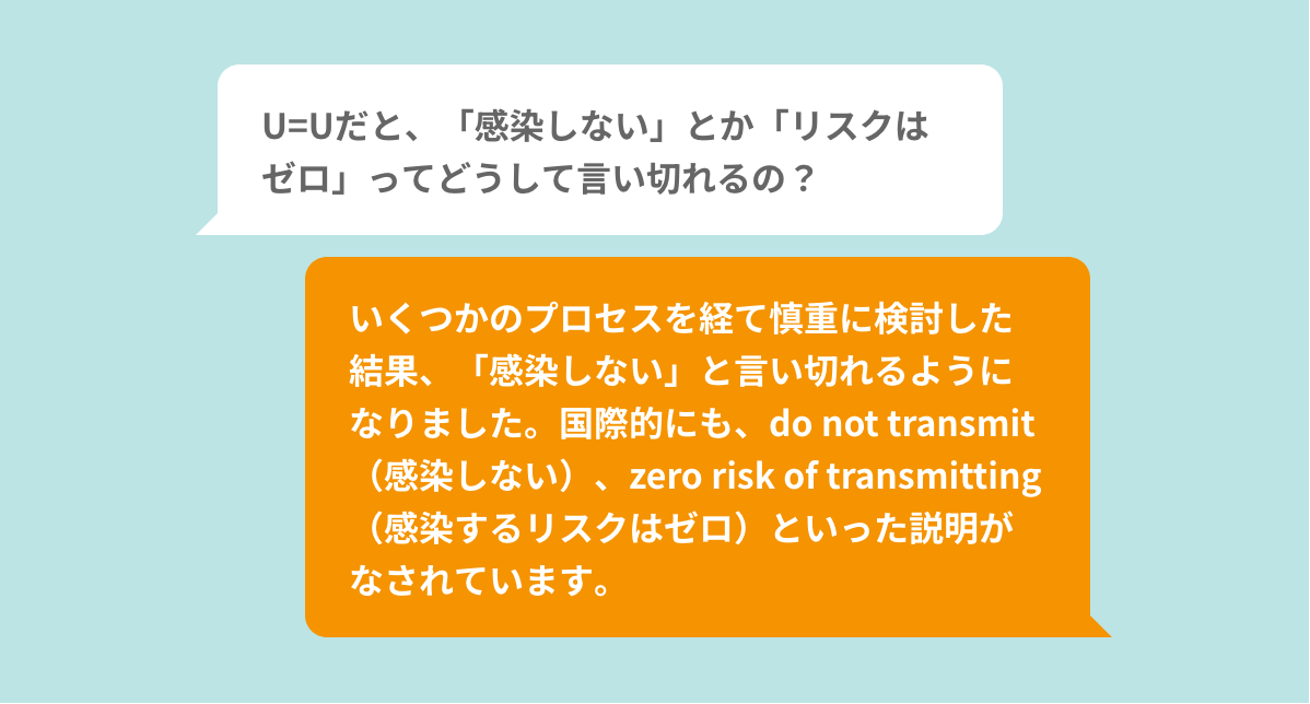 $description = U=Uだと、「感染しない」とか「リスクはゼロ」ってどうして言い切れるの? - いくつかのプロセスを経て慎重に検討した結果、「感染しない」と言い切れるようになりました。国際的にも、do not transmit(感染しない)、zero risk of transmitting(感染するリスクはゼロ)といった説明がなされています。