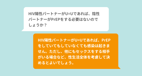 $description = HIV陽性パートナーがU=Uであれば、陰性パートナーがPrEPをする必要はないのでしょうか? - HIV陽性パートナーがU=Uであれば、PrEPをしていてもしていなくても感染は起きません。ただし、他にもセックスをする相手がいる場合など、性生活全体を考慮して決めるとよいでしょう。
